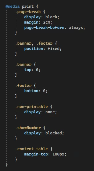 ![]() | @media print { .page-break { display: block; margin: 2cm; page-break-before: always; } .banner, .footer { position: fixed; } .banner { top: 0; } .footer { bottom: 0; } .non-printable { display: none; } .showNumber { display: blocked; } .content-table { margin-top: 100px; } } |